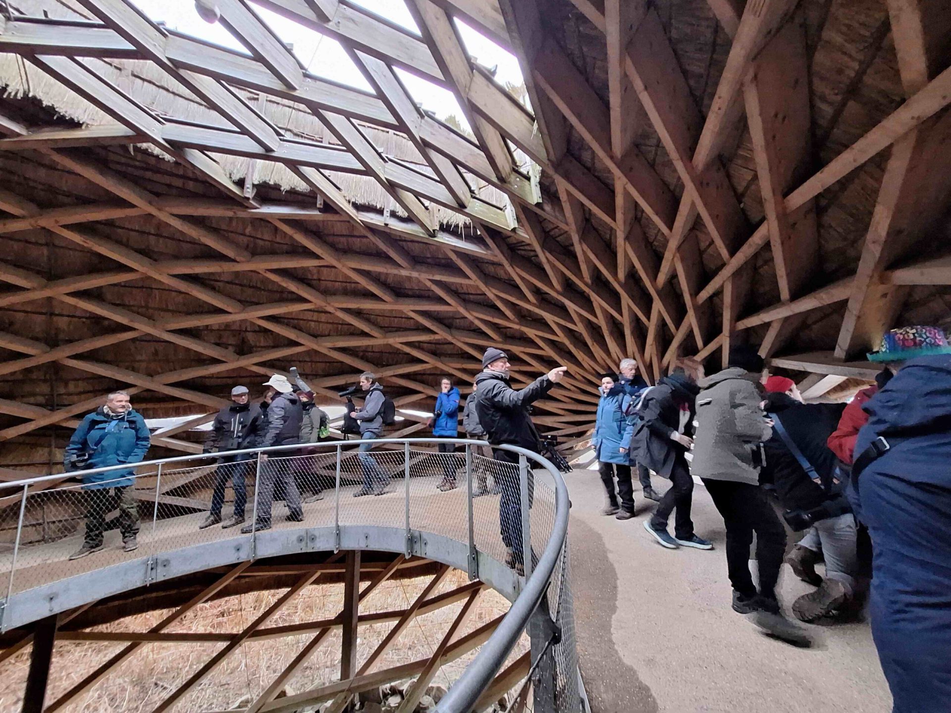 Na een welkomstwoord van organisator Bert van de Bulk aan de 40 koppen tellende groep stappen we door de miezerregen door een haag van riet en boompjes naar de prachtig vormgegeven hut. Door de mazen van de dynamische constructie zien we vogels aan het ontbijtbuffet op de zandbank verderop. We worden getrakteerd op onder meer grote zaagbek, bergeend, wintertaling, brandgans en kolgans.