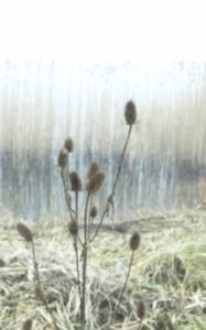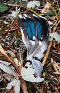Bij de ZHP kijken we uit op het oeverzwaluw-landtongetje. Hierop staan nog vele kaardenbollen. Oeverzwaluwen zien we niet. Op een eilandje zien we restanten van een wintertaling: de groene vleugeluiteinden. Een vos heeft er een goed maaltje aan gehad. Dat het beest gepakt is door een vos zie je aan de afgebeten vleugels en veren. Een havik of een sperwer plukt zijn prooi.