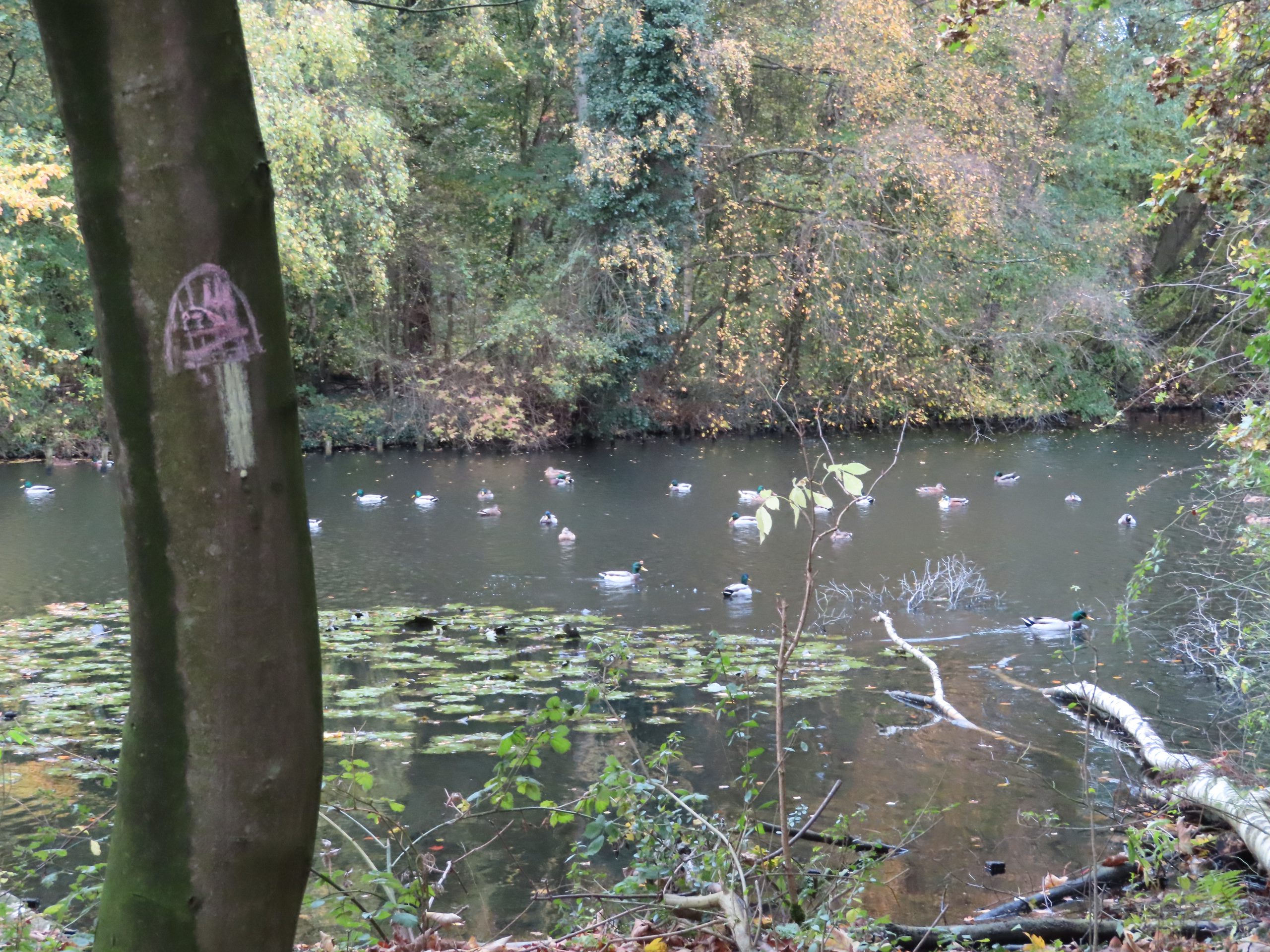 Vanaf vanochtend kun je op eigen houtje aan onze individuele ledenexcursie deelnemen. Hans, Marion en ik hebben het rondje door het Schiebroekse Park nog eens gelopen. Dit keer gewapend met een flinke doos stoepkrijt.